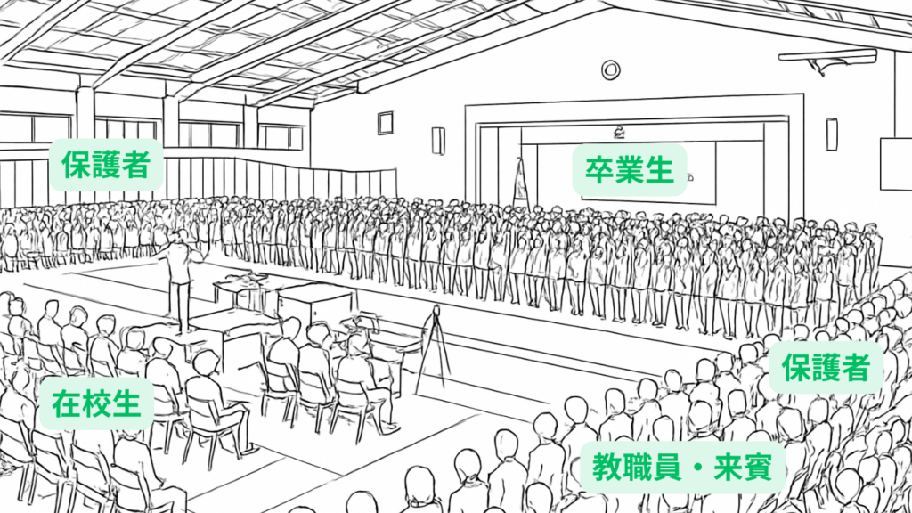 対面式では卒業生・在校生・保護者・教職員・来賓が同じフロアで向かい合います。